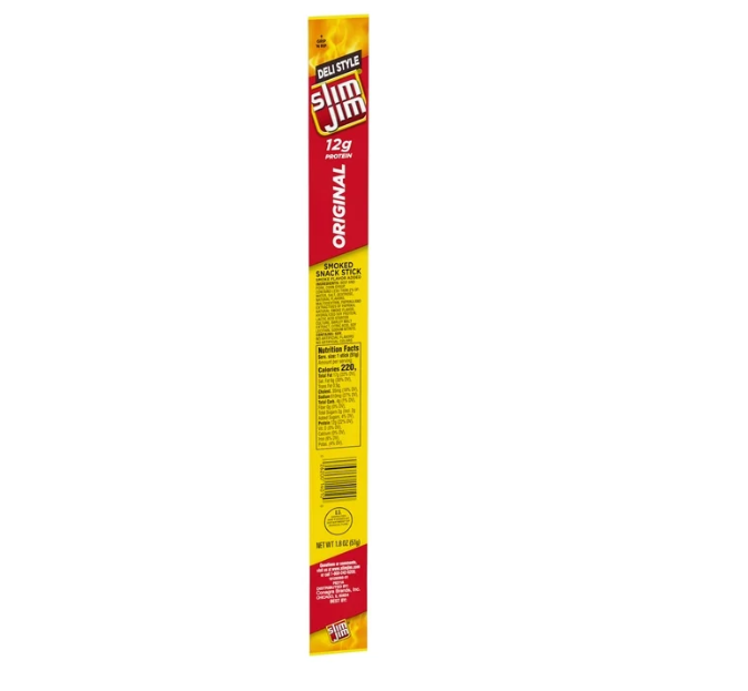 Experience smoky, savory flavor with delicious Slim Jim Original Deli Style Meat Sticks. Made with beef, pork and chicken, these snack sticks contain no artificial flavors or colors for full meaty flavor everyone can love. Each meat stick serving is loaded with 6 grams of protein, ideal for protein snacks that kick hunger to the curb and leave you feeling satisfied. These individually wrapped snacks go where you go and are perfect as travel snacks, school snacks or anywhere meat snacks. Slim Jim Original Deli Style Meat Sticks offer a bold and tasty way to take on the day. The individual snacks are easy to take on the go, so you are ready to hit back when savory cravings hit. Slim Jim keeps it interesting with a full line of beef sticks, snack sticks, pork rinds and beef jerky. Snap into a Slim Jim(R)!