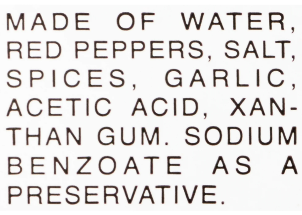 Water, Red Peppers, Salt, Spices, Garlic, Acetic Acid, Xanthan Gum. Sodium Benzoate as a Preservative.