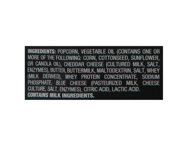 Popcorn, Vegetable Oil (Contains One or More of the Following: Corn, Cottonseed, Sunflower, or Canola Oil), Cheddar Cheese (Cultured Milk, Salt, Enzymes), Butter, Buttermilk, Maltodextrin, Salt, Whey (Milk Derived), Whey Protein Concentrate, Sodium Phosphate, Blue Cheese (Pasteurize