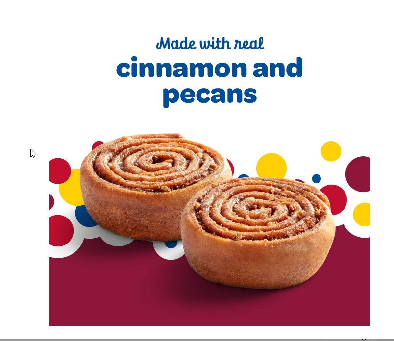 UNBLEACHED ENRICHED FLOUR (WHEAT FLOUR, MALTED BARLEY FLOUR, NIACIN, REDUCED IRON, THIAMIN MONONITRATE, RIBOFLAVIN, FOLIC ACID), WATER, SUGAR, VEGETABLE OIL (PALM OIL AND SOYBEAN OIL), CORN SYRUP, HIGH FRUCTOSE CORN SYRUP, YEAST, CONTAINS 2% OR LESS OF EACH OF THE FOLLOWING: CINNAMON, PECANS, SALT, MONOGLYCERIDES, CORN STARCH, SOY LECITHIN, DEXTROSE, NATURAL AND ARTIFICIAL FLAVOR, CALCIUM STEAROYL LACTYLATE, SODIUM STEAROYL LACTYLATE, ENZYMES, POLYSORBATE 80, WHEAT FLOUR, EGG YOLKS, CINNAMIC ALDEHYDE, COLORED WITH EXTRACTIVES OF TURMERIC AND ANNATTO SEED, EGGS, GUAR GUM, LEAVENING (BAKING SODA), PRESERVED WITH CALCIUM PROPIONATE AND SODIUM PROPIONATE.