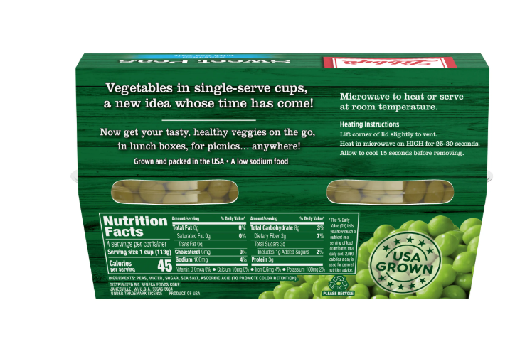Eat on the go with Libby's Sweet Peas Individual Cups. Vegetables in single-serve cups enable those in a hurry to get their hunger issues resolved with a healthy snack. Use this fat-free vegetable to provide a tasty, healthy snack in lunch boxes, for picnics, in the office, or anywhere else you wish to go. Lightly seasoned with sea salt, these microwaveable cups are full of farm fresh goodness. This handy four-pack of tender, tasty peas is low in sodium and free of trans fat and saturated fats. Be sure to check out the entire line of Libby's microwavable vegetable cups for convenient lunch packing and healthy snacking. Keep Libby's Sweet Peas Individual Cups on hand for all of your mealtime needs.