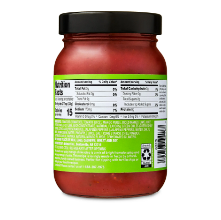 Tomatoes (Tomatoes, Tomato Juice), Water, Mango Puree, Diced Mango, Lime Juice (Filtered Water, Key Lime Juice Concentrate, Natural Flavors), Green Chiles (Green Chile Peppers, Citric Acid [preservative]), Jalapeno Peppers (Jalapeno Peppers, Water, Salt), Onion, Brown Sugar, Water, Pineapple Juice, Salt, Corn Starch, Chile Powder, Dehydrated Garlic, Paprika, Natural Mango Flavor, Dehydrated Cilantro.