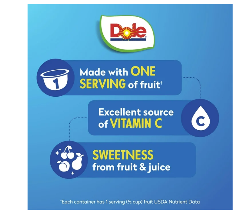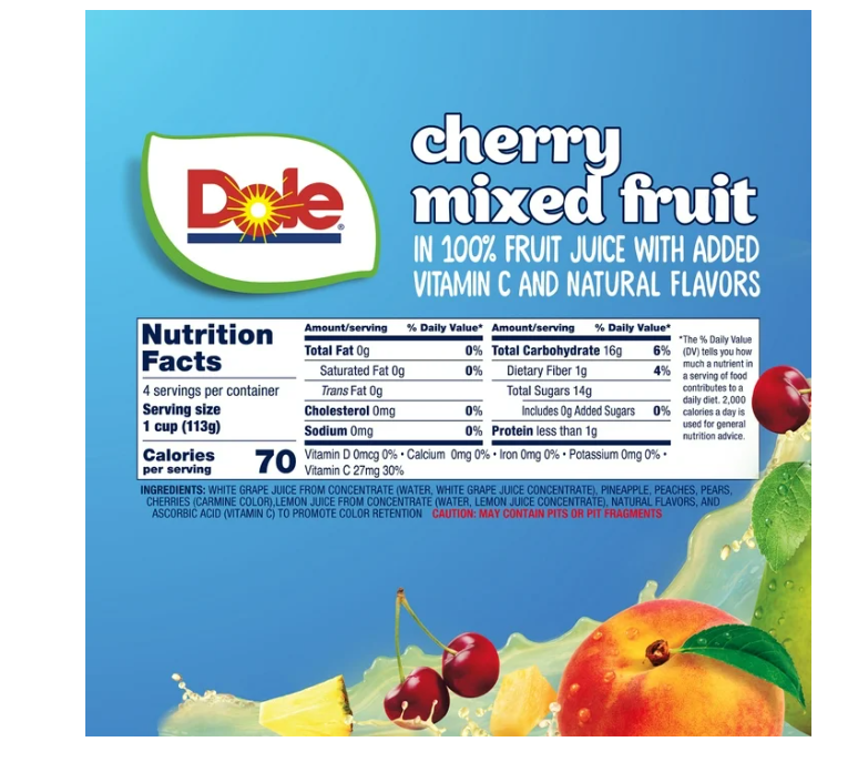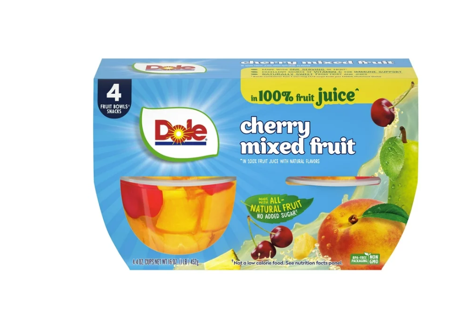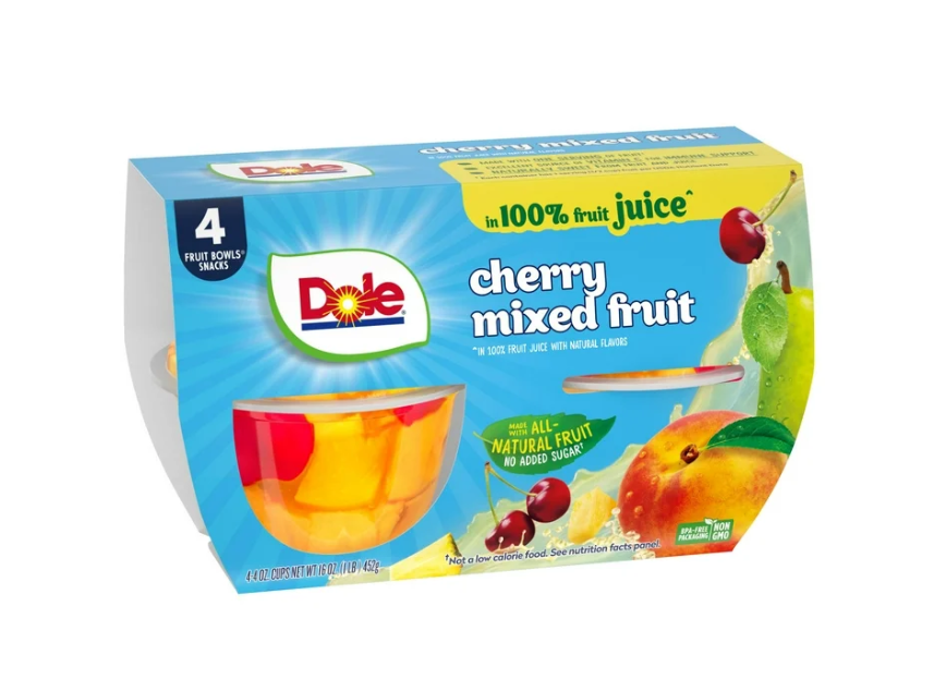 Juicy, bite-sized cherries, diced pineapple, diced peaches, and diced pears in 100% fruit juice! Dole Cherry Mixed Fruit Fruit Bowls combine bite-sized cherry, pineapple, peach, and pear chunks with 100% fruit juice for a delightfully satisfying snack in a convenient plastic bowl. Rich in Vitamin C, each of the 4 Dole Cherry Mixed Fruit in 100% Fruit Juice Fruit Bowls are made with the nutritional goodness of real fruit, making them the ideal snack for breakfast, lunch, dinner, or any time you're craving a sweet treat. With Dole's shelf-stable products, you can have the delicious taste of refreshing fruit anywhere, anytime.