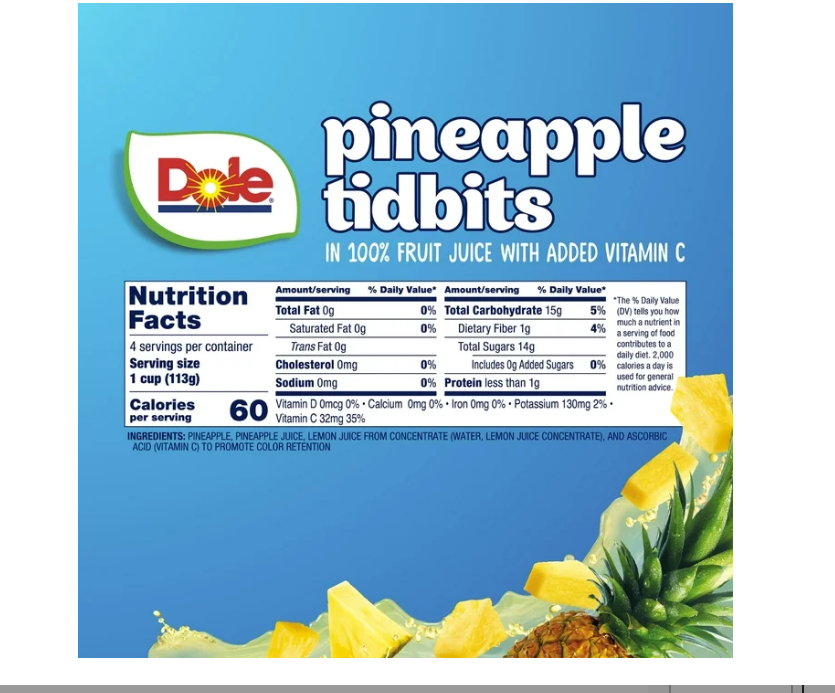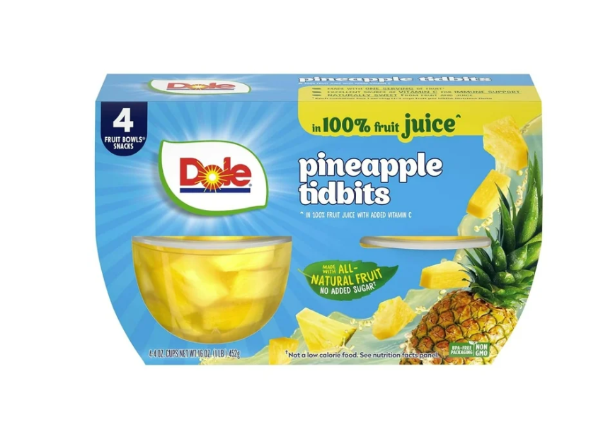 Juicy, diced pineapple in 100% fruit juice! Dole Pineapple Tidbits Fruit Bowls combine bite-sized pineapple chunks with 100% fruit juice for a delightfully satisfying snack in a convenient plastic bowl. Rich in Vitamin C, each of the 4 Dole Pineapple Tidbits in 100% Fruit Juice Fruit Bowls are made with the nutritional goodness of real fruit, making them the ideal snack for breakfast, lunch, dinner, or any time you're craving a sweet treat. With Dole's shelf-stable products, you can have the delicious taste of refreshing fruit anywhere, anytime.