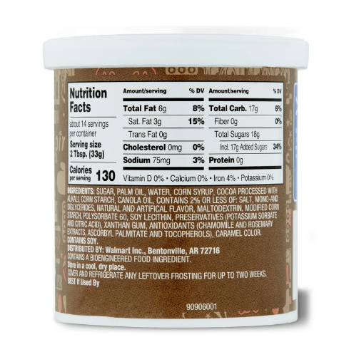Transform your dessert into a decadent treat with a few spoonful's of Great Value Chocolate Frosting. This thick and creamy chocolate frosting is the perfect addition to all your favorite recipes. Top moist vanilla cupcakes, add flair to cinnamon and sugar cookies, or decorate a cake with your loved one's favorite flavor. With 14 servings per tub, you'll have enough for all of your culinary confections. No chocoholic should be without a tub of Great Value Chocolate Frosting.