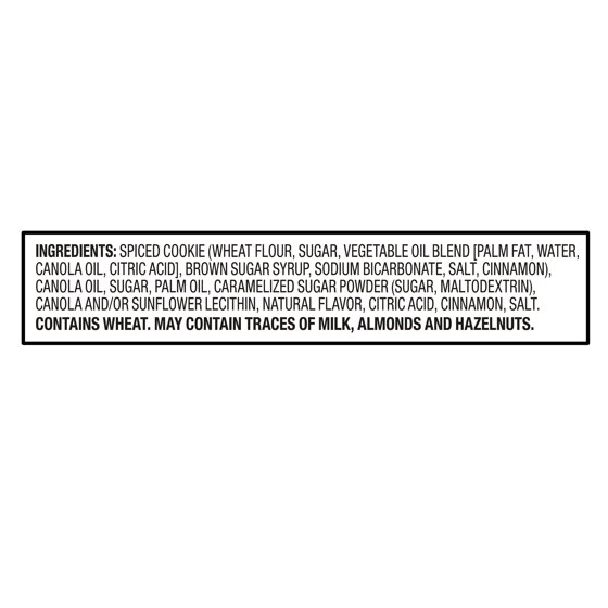 SPICED COOKIE (WHEAT FLOUR, BROWN SUGAR, PALM OIL, SUGAR, GLUCOSE-FRUCTOSE SYRUP, CARAMELIZED SUGAR SYRUP, RICE FLOUR, NATURAL FLAVOR, CINNAMON, INVERT SUGAR, CARAMEL [SUGAR, WATER], SALT, SODIUM BICARBONATE), RAPESEED OIL, SUGAR, PALM OIL, SUNFLOWER LECITHIN, NATURAL FLAVOR.