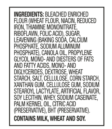 BLEACHED ENRICHED FLOUR (WHEAT FLOUR, NIACIN, REDUCED IRON, THIAMINE MONONITRATE, RIBOFLAVIN, FOLIC ACID), SUGAR, LEAVENING (BAKING SODA, CALCIUM PHOSPHATE, SODIUM ALUMINUM PHOSPHATE), CANOLA OIL, PROPYLENE GLYCOL MONO- AND DIESTERS OF FATS AND FATTY ACIDS, MONO-AND DIGLYCERIDES, DEXTROSE, WHEAT STARCH, SALT, CELLULOSE, CORN STARCH, XANTHAN GUM, CELLULOSE GUM, SODIUM STEAROYL LACTYLATE, ARTIFICIAL FLAVOR, SOY LECITHIN, WHEY, SODIUM CASEINATE, PALM KERNEL OIL, CITRIC ACID (PRESERVATIVE), BHT (PRESERVATIVE).