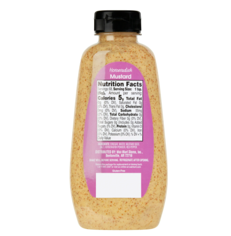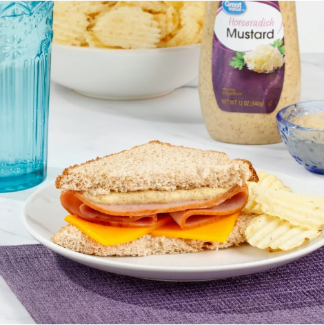 Bring the heat with Great Value Horseradish Mustard. This tasty mustard combines the sharp taste of vinegar and mustard seeds with the spice of horseradish to amp up your favorite meals. Spread it on toasted bread with turkey breast, ham, or roast beef, and top with tomatoes, pickles, and crispy lettuce for an elevated deli sandwich. Coat chicken breasts with this tangy mustard and cover in breadcrumbs for an oven-baked dinner that's both health-conscious and delicious. Mix a dollop of this horseradish mustard with olive oil, a splash of lemon juice or white vinegar, and oregano for the best salad dressing you can make at home. Great Value Horseradish Mustard will be a flavor powerhouse for your home cooking. Great Value products provide families with affordable, high quality grocery and household consumable options. With our wide range of product categories spanning grocery and household consumables, we offer you a variety of products for your family's needs. Our products are conveniently available online and in Walmart stores nationwide, allowing you to stock up and save money at the same time.