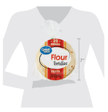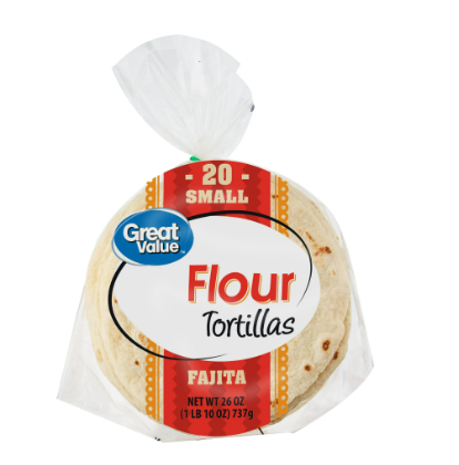 Sizzle up a delicious dinner tonight with Great Value Small Fajita Flour Tortillas. Recreate your favorite restaurant dish with this 20-pack of small flour tortillas by making fajitas, soft tacos, enchiladas, mini-burritos, or cheese roll-ups. You can fill them with steak, chicken, beans, ground beef, or veggies, and top them with cheese, sour cream, salsa, guacamole, and hot sauce for a delicious explosion of flavor. You can also fry them with a little butter, brown sugar, and cinnamon for a sweet dessert! You will treat your family to a tasty fiesta with Great Value Small Fajita Flour Tortillas.