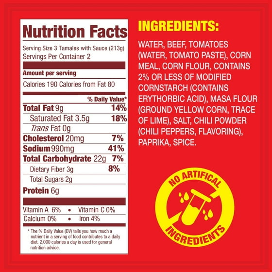 Ingredients: Water, Beef, Tomatoes (Water, Tomato Paste), Corn Meal, Corn Flour, Contains 2% or less of Modified Cornstarch (Contains Erythorbic Acid), Masa Flour (Ground Yellow Corn, Trace of Lime), Salt, Chili Powder (Chili Peppers, Flavoring), Paprika, Spice.