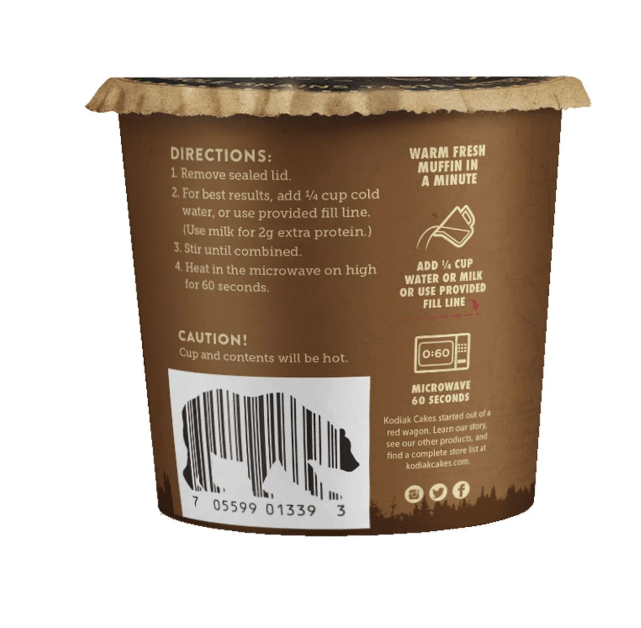 Kodiak Chocolate Chip Muffin Cup is meant for those who require nutrition, energy, and great taste as they take on the day. This shelf-stable muffin cup is crafted with 100% whole grains, semisweet chocolate chips, and 12 grams of protein per serving. Add milk or water, stir, and microwave for one minute. Enjoy this microwaveable muffin cup before you take on your next adventure, from back-to-back meetings to wrangling the cubs for school.