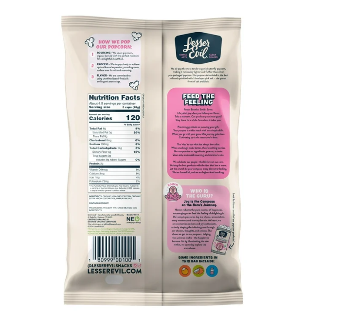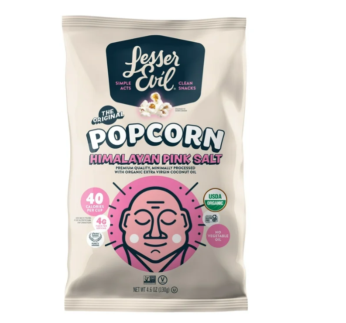 This 4.6 oz bag of LesserEvil Organic Popcorn, Himalayan Pink, is a simpe 120 calories per serving, making it a satisfying snack you can still feel zen about. Packaging may vary.
