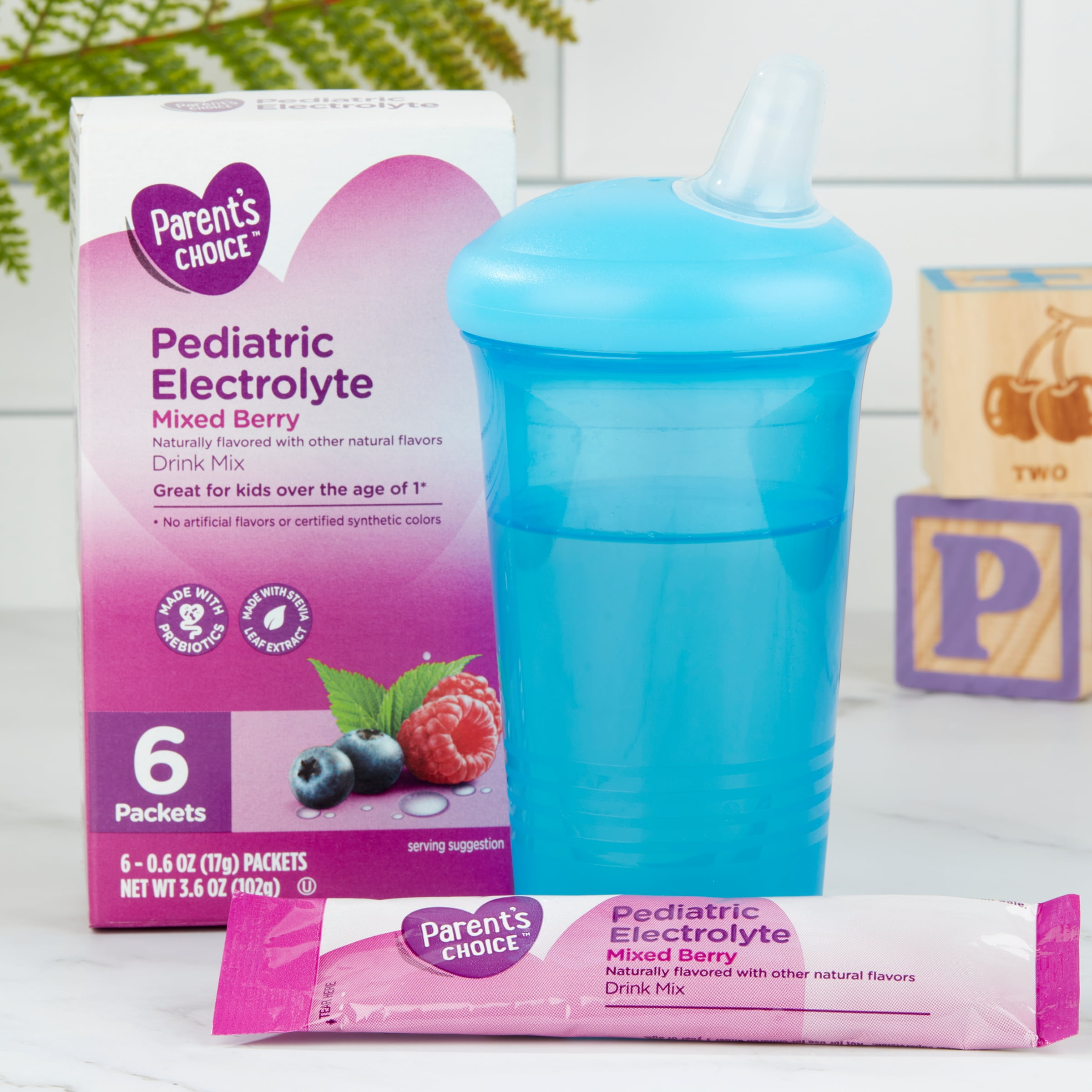 Parent's Choice Mixed Berry Pediatric Electrolyte Drink Mix is a convenient and delicious way to rehydrate your busy kids on the go. Our drink mix delivers electrolytes to replenish vital minerals and fluids and reduce dehydration caused by exercise, sickness, or heat exhaustion. This box includes 6 individual-sized packets that are perfect to take in a sports bag, backpack, or diaper bag for busy or active days. This formula includes probiotics for good digestive care and Stevia leaf extract that satisfies sweetness without the extra sugars found in juice boxes and sports beverages. Help your child replace essential fluids and minerals they need to thrive with Parent's Choice Mixed Berry Pediatric Electrolyte Drink Mix.