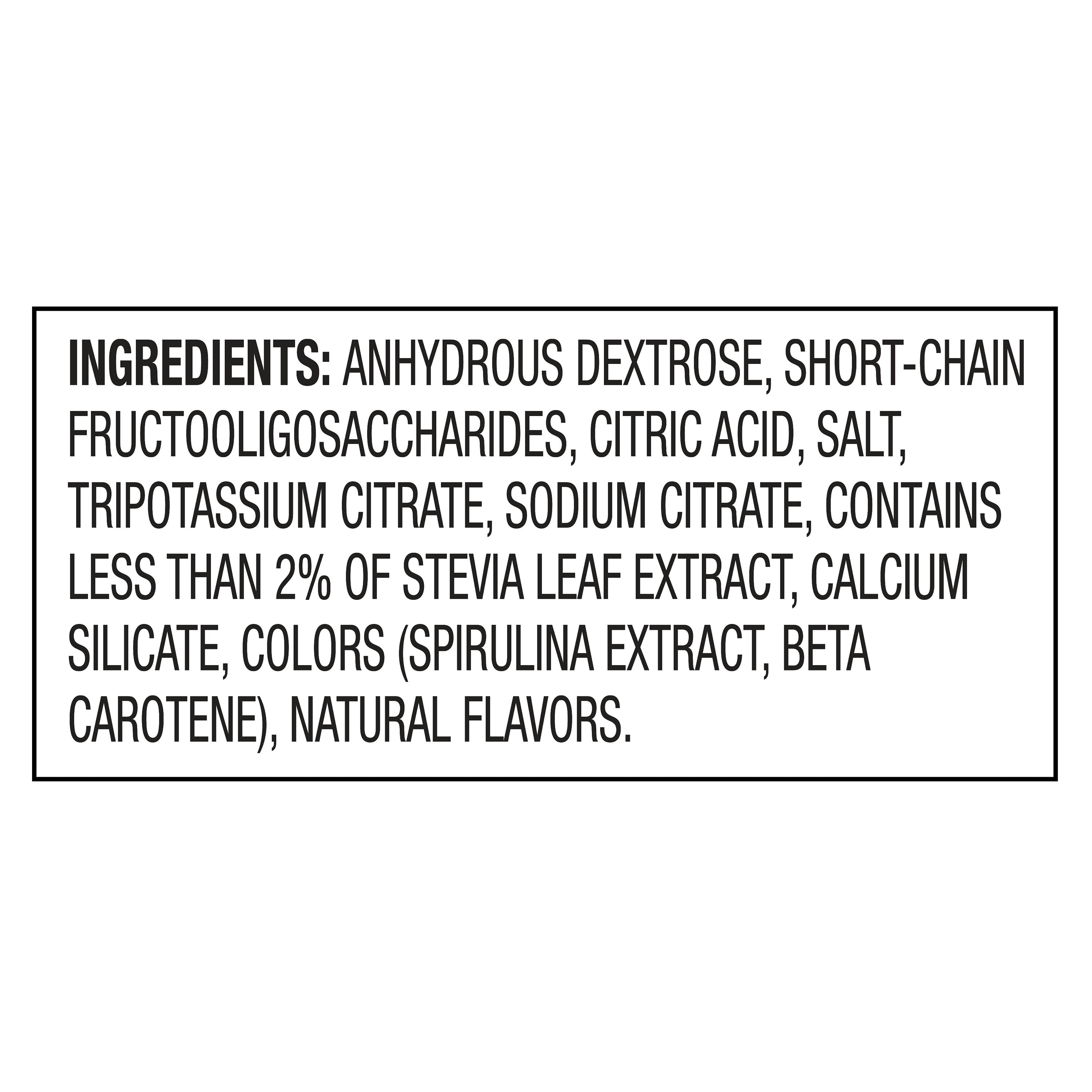 Anhydrous Dextrose, Short-Chain Fructooligosaccharides, Citric Acid, Salt, Tripotassium Citrate, Sodium Citrate, Contains less than 2% of Stevia Leaf Extract, Calcium Silicate, Colors (Spirulina Extract, Beta Carotene), Natural Flavors