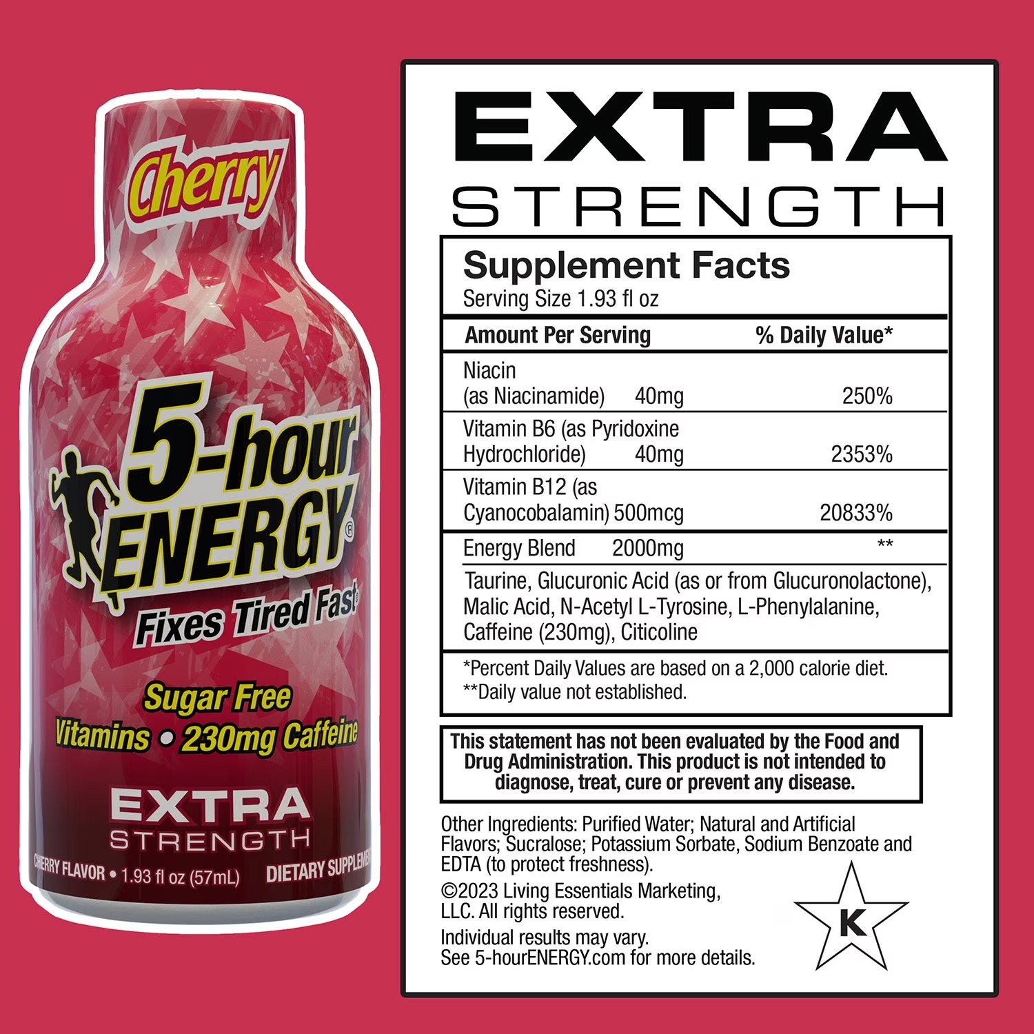 Extra Strength Cherry flavor 5-hour ENERGY® shots are not your everyday energy drink. They are only available at select retailers and for a limited time. Don't miss your chance to experience this rare, delicious flavor. Extra Strength Cherry flavor 5-hour ENERGY® - a sweet indulgence that's hard to resist.