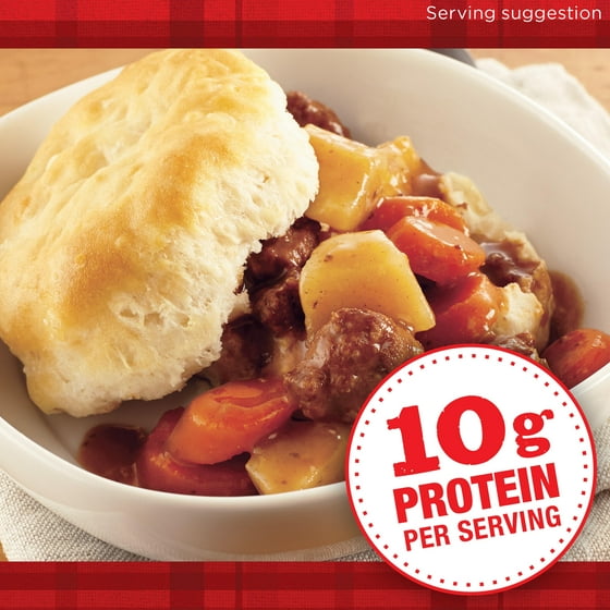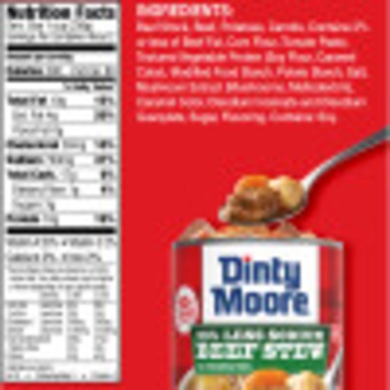 BEEF STOCK, BEEF, POTATOES, CARROTS, CONTAINS 2% OR LESS OF BEEF FAT, CORN FLOUR, TOMATO PASTE, TEXTURED VEGETABLE PROTEIN (SOY FLOUR, CARAMEL COLOR), MODIFIED FOOD STARCH, POTATO STARCH, SALT, MUSHROOM EXTRACT (MUSHROOMS, MALTODEXTRIN), CARAMEL COLOR, DISODIUM INOSINATE AND DISODIUM GUANYLATE, SUGAR, FLAVORING.