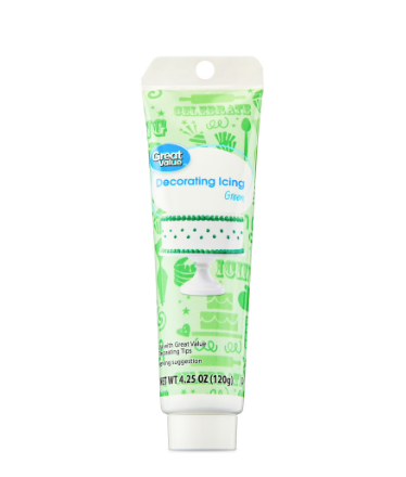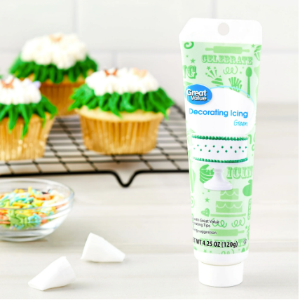 Transform any dessert into edible art with Great Value Green Decorating Icing. This green icing is your secret weapon to take your sweet treats to the next level. Create cupcakes in honor of your favorite sports team, serve up seasonal goodies, or make a frosted forest wonderland on a nature-themed cake. At only 25 calories per teaspoon with no saturated or trans fat, you can afford to add a little more. Complete your culinary creations with Great Value Green Decorating Icing.