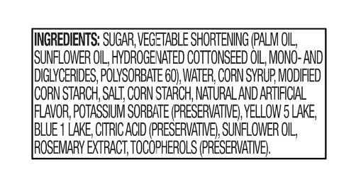 Sugar, Vegetable Shortening (Palm Oil, Sunflower Oil, Hydrogenated Cottonseed Oil, Mono- and Diglycerides, Polysorbate 60), Water, Corn Syrup, Modified Cornstarch, Salt, Cornstarch, Natural and Artificial Flavor, Potassium Sorbate (Preservative), Yellow 5 Lake, Blue 1 Lake, Citric Acid (Preservative), Sunflower Oil, Rosemary Extract, Tocopherols (Preservative)