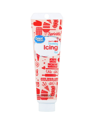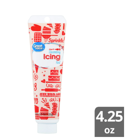 Transform boring, bland desserts into edible art with Great Value Red Decorating Icing. This red icing is your secret weapon to take your sweet treats to the next level. Create cupcakes in honor of your favorite sports team, serve up seasonal goodies, or make a heart-shaped cake for your sweetheart. At only 25 calories per teaspoon with no saturated or trans fat, you can afford to add a little more. Complete your culinary creations with Great Value Red Decorating Icing.