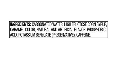 Carbonated Water, High Fructose Corn Syrup, Caramel Color, Natural and Artificial Flavor, Phosphoric Acid, Potassium Benzoate (Preservative), Caffeine
