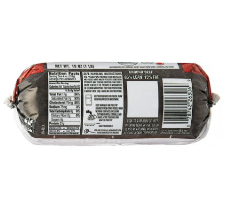 85% Lean/15% Fat Ground Beef Roll, 1lb (Frozen)