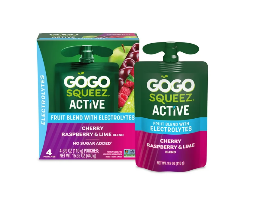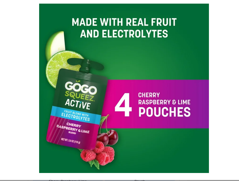 (9 pack) GoGo squeeZ Active Electrolyte No Sugar Added Cherry Lime Raspberry Fruit Blend Pouches, 3.9 oz (4 Pack)
