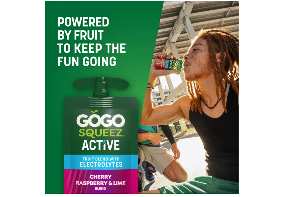Keep the fun going with GoGo squeeZ Active Fruit Blend with Electrolytes, a sports snack made for an active lifestyle. Powered by real fruit and enriched with antioxidants Vitamin C, Vitamin A, and Vitamin E, this snack also contains electrolytes to help replenish essential minerals lost through sweat. With no added sugar* and a gluten-free recipe, these pouches are a convenient, kid-friendly fuel for any activity. 20% bigger✝ pouches provide even more deliciousness to squeeze and snack on.