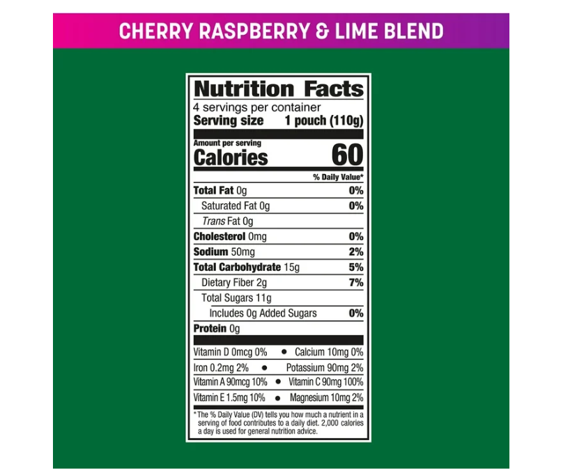 Apples, Cherry Puree, Raspberry Puree, Lime Juice, Electrolyte and Antioxidant Blend (Ascorbic Acid (Vitamin C), Sodium Citrate, Beta Carotene (Vitamin A), Magnesium Oxide, Dl-Alpha Tocopheryl Acetate (Vitamin E)), Lemon Juice Concentrate