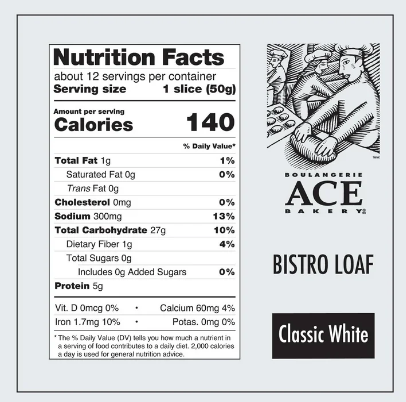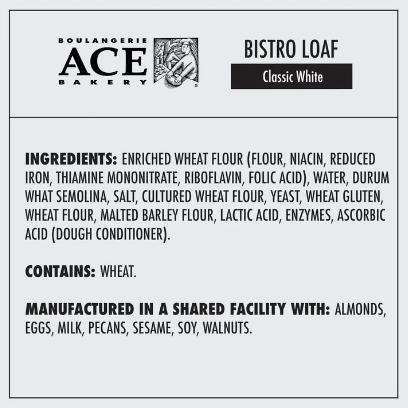 A delicious and versatile bread that can elevate any sandwich or breakfast dish, the ACE Bakery® Classic White Bistro Loaf bread is crafted with the finest ingredients and bakes using time honored European techniques. Our ACE Bakery® Classic White Bistro sliced bread has a delightfully light and airy texture, a soft and moist crumb that melts in your mouth. Sealed for freshness and contains a 5 day shelf-life. It's perfect for toasting, sandwiches, or simply enjoying with a spread of butter. A versatile classic that's ready to enhance your favorite dishes.