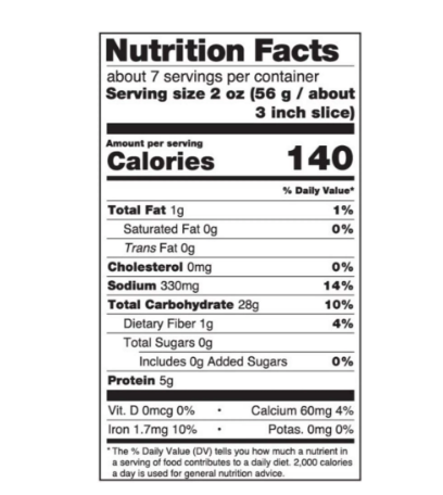 | Serving size: | 2 oz (56 g / about 3 inch slice) |