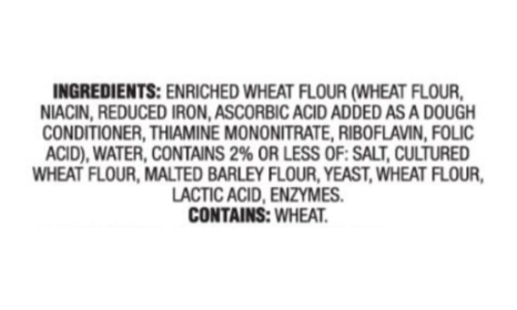 INGREDIENTS: ENRICHED WHEAT FLOUR (WHEAT FLOUR NIACIN, REDUCED IRON, ASCORBIC ACID ADDED AS A DOUGH CONDITIONER, THIAMINE MONONITRATE, RIBOFLAVIN, FOLIC ACID), WATER, CONTAINS LESS THAN 2% OF: SALT, CULTURED WHEAT FLOUR, YEAST, MALTED BARLEY FLOUR, WHEAT FLOUR, LACTIC ACID, ENZYMES.