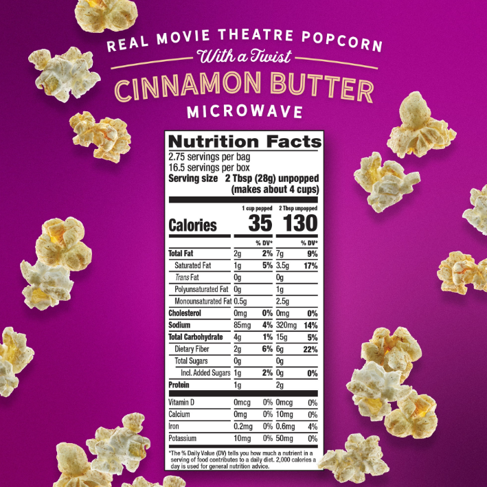 Contains (6) 2.75 oz. bags of AMC Theatres Microwave Popcorn, Cinnamon Butter