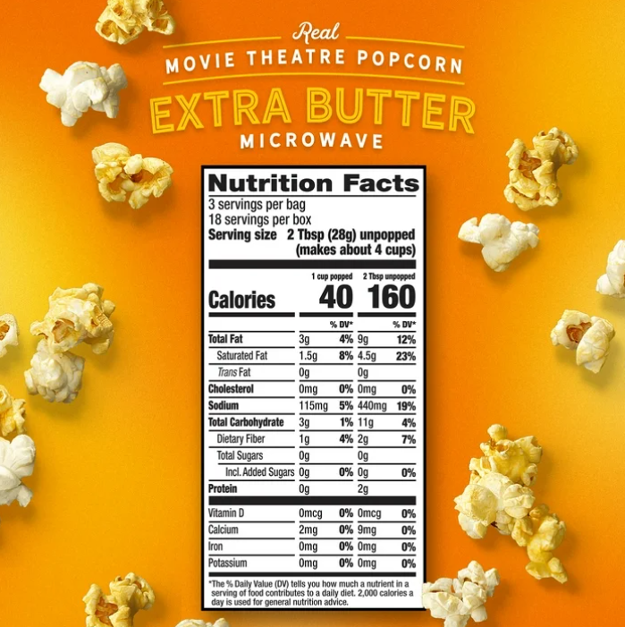 - Contains (6) 2.75 oz. bags of AMC Theatres Microwave Popcorn, Extra Butter. Also includes (6) 10g buttery topping packets
