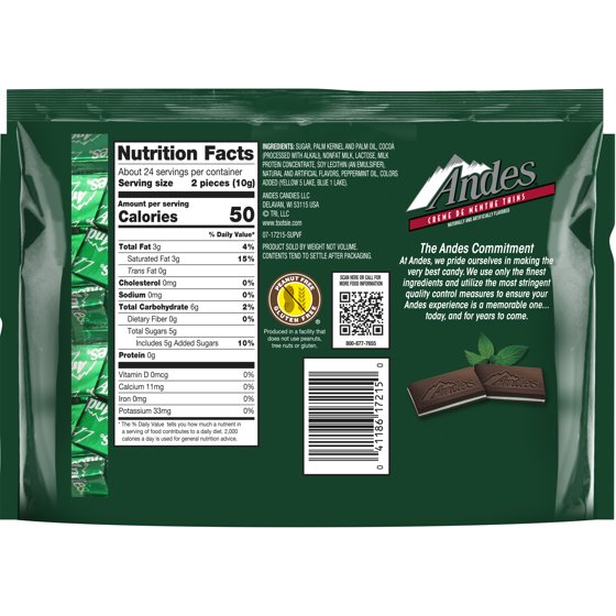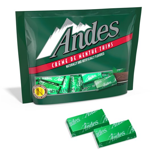 Andes, Crème de Menthe, Mint Chocolate Candy, 8.5 oz. Gluten Free & Peanut Free. Contains Milk.