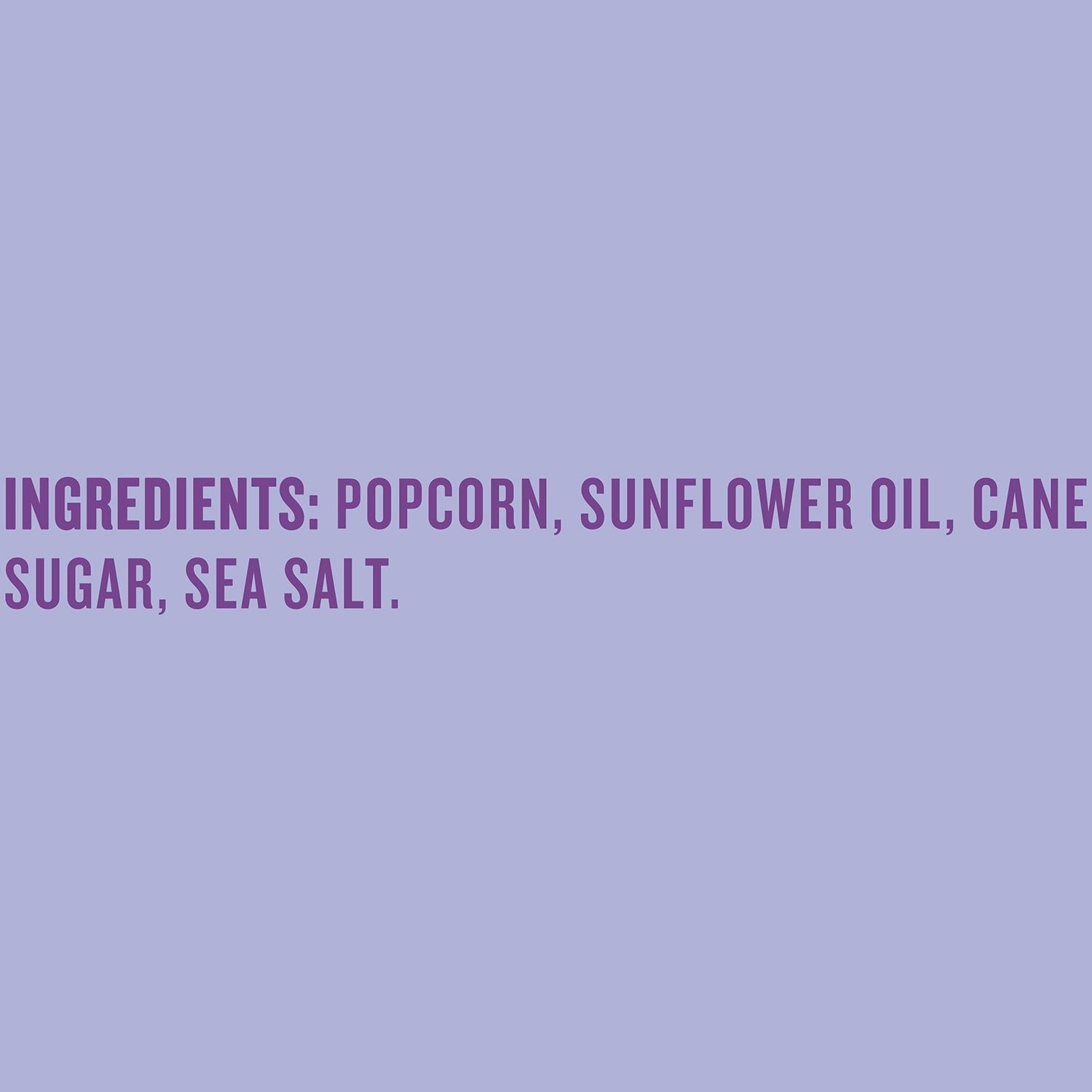 Ingredients: Popcorn, Sunflower Oil, Cane Sugar, Sea Salt.