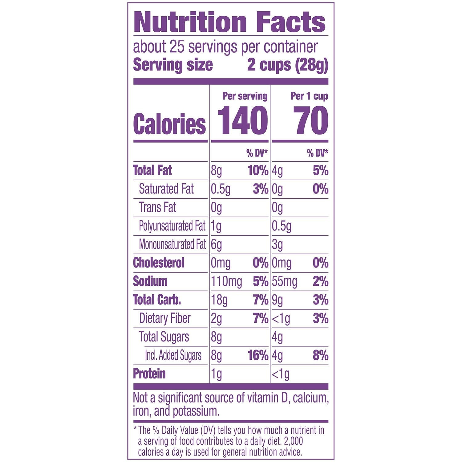 Each bag contains 23, two-cup servings per container. Each serving has 140 calories, giving the snack just 70 calories per cup. The sweet and salty kettle corn has eight grams of fat and 8 grams of sugar. However, it only has 110 milligrams of sodium. Consumers also get 4% of their daily value of iron in each serving.