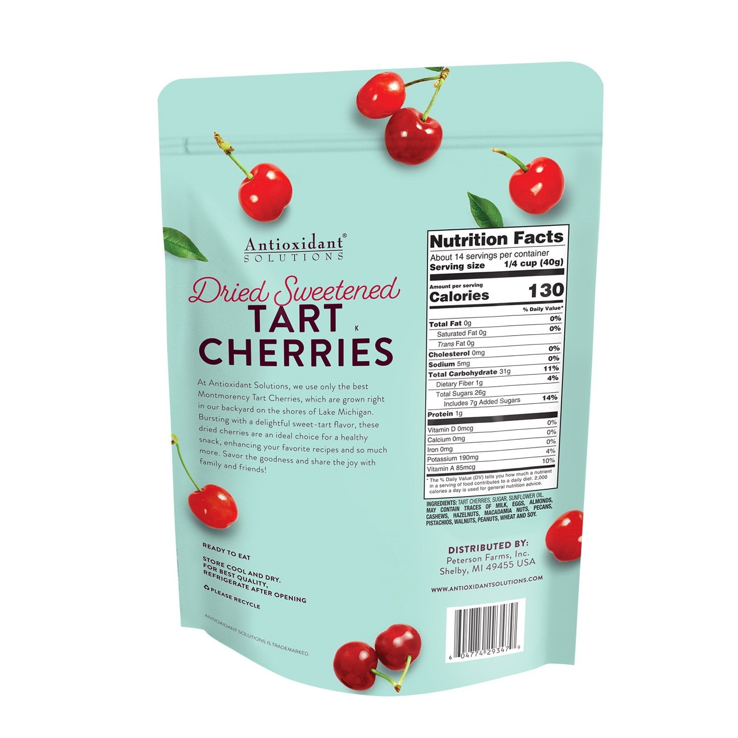 At Peterson Farms, Antioxidant Solutions, we use only the best Montmorency Tart Cherries, which are grown right in our backyard on the shores of Lake Michigan. Bursting with a delightful sweet-tart flavor, these dried cherries are an ideal choice for a healthy snack, enhancing your favorite recipes and so much more. Savor the goodness and share the joy with family and friends!
