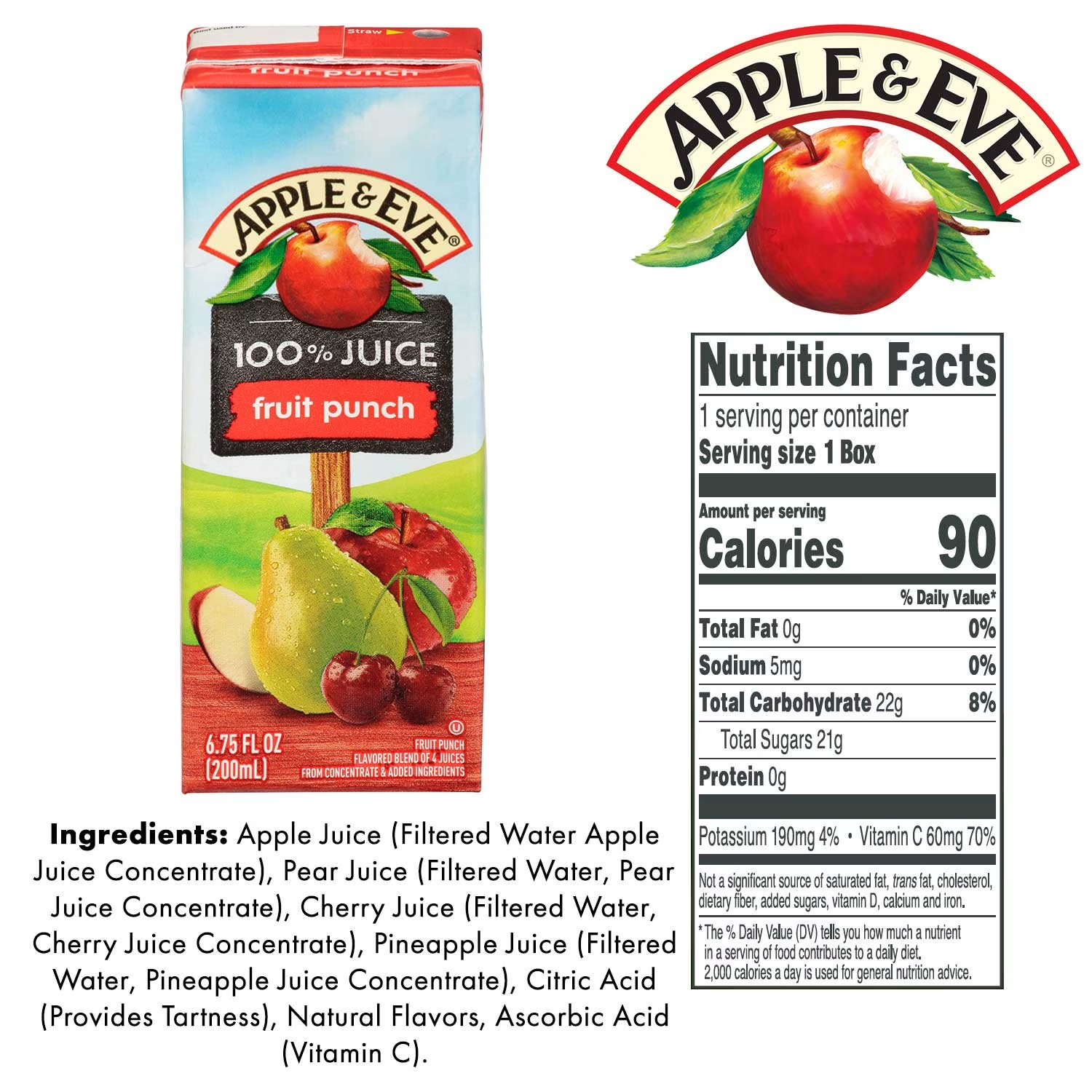 Each juice box contains real fruit juice from concentrate. It also has no artificial flavors or colors. This Apple & Eve juice is pasteurized, fortified with calcium and includes vitamins for a flavorful, yet nutritional drink. The beverage also comes in aseptic boxes for safe storage.