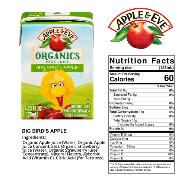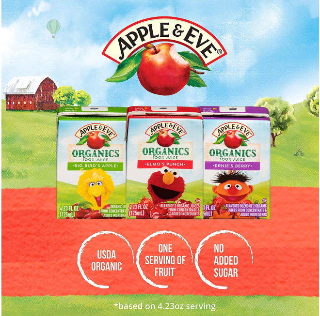 Apple & Eve Sesame Street USDA Organic 100% juice boxes are made with honest ingredients and have the juicy goodness kids love.