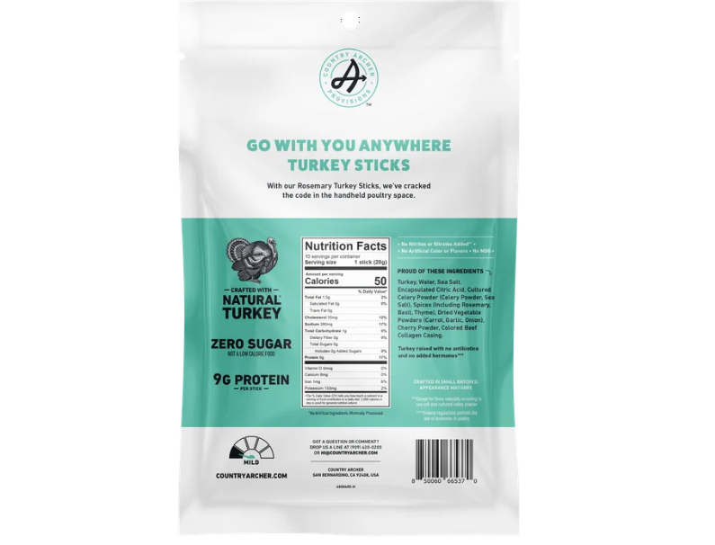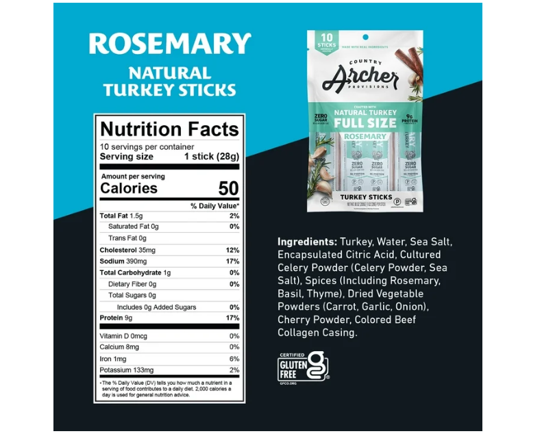 Tender, herb-seasoned turkey in a full-size, flavor-packed snack stick. Archer Rosemary Turkey Sticks are crafted with all-natural turkey, seasoned with real rosemary and thyme, and contain zero sugar, zero preservatives, and 9g of protein per stick. No mystery meat, no artificial anything—just craveable, clean snacking in a convenient, full-size stick that fits anywhere your day takes you.