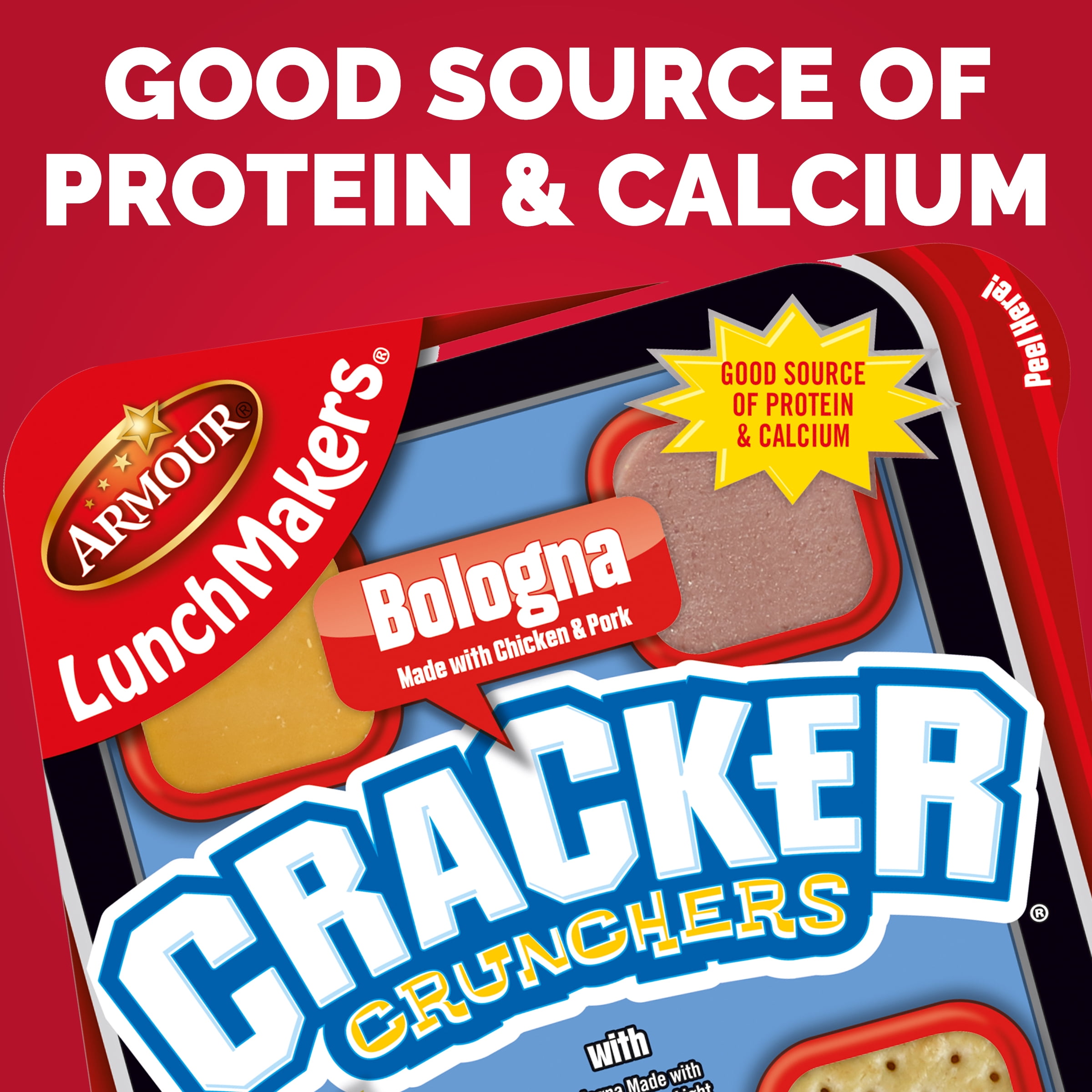 Armour LunchMakers Bologna & Cheese Kit with Butterfinger includes everything you need for fun snacks at home or lunch on the go. These lunch kits for kids include chicken and pork bologna lunch meat, American cheese slices, and buttercrisp crackers for delicious sandwich stacking, plus a Butterfinger for a tasty dessert. This bologna deli meat, cheese, and crackers lunch kit is a good source of protein and calcium. LunchMakers portable meal kits require no meal preparation, making them ideal for school lunch or quick kids' lunch snacks at home. Just peel back the plastic film and assemble your cracker sandwiches for a convenient snack or meal. One Armour lunch kit for kids serves one person. Refrigerate Armour LunchMakers meal kits to maintain freshness.