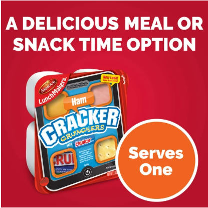 Armour LunchMakers Ham and Cheese Portable Meal Kit with Crunch Bar includes everything you need for a fun snack at home or on the go. These kids lunch meals include ham deli meat, American cheese slices and crackers for delicious sandwich stacking, plus a Crunch Bar serves as a scrumptious dessert. These Armour Lunch cheese and crackers snacks provide a delicious meal or snacktime option that is a good source of both protein and calcium. LunchMakers to go snacks require no meal preparation, making them ideal for kids, whether at home, at school lunch or on the go. Just peel back the plastic film and assemble your cracker sandwiches for a convenient snack or quick lunch. One Armour LunchMakers Ham and Cheese Portable Meal Kit with Crunch Bar serves one person. Keep Armour LunchMakers Ham Portable Meal Kit to go lunches refrigerated to maintain freshness.