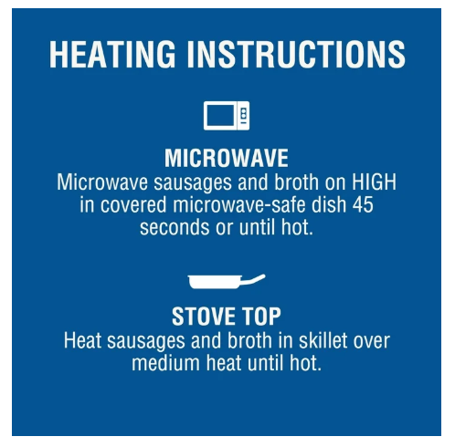 Heating Directions: Microwave: Microwave sausages and broth on high in covered microwave-safe dish 45 seconds or until hot. Stove Top: Heat sausages and broth in skillet over medium heat until hot.