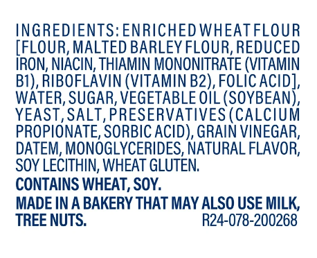 Enriched Wheat Flour [Flour, Malted Barley Flour, Reduced Iron, Niacin, Thiamin Mononitrate (Vitamin B1), Riboflavin (Vitamin B2), Folic Acid], Water, Sugar, Vegetable Oil (Soybean), Yeast, Salt, Preservatives (Calcium Propionate, Sorbic Acid), Grain Vinegar, DATEM, Monoglycerides, Natural Flavor, Soy Lecithin, Wheat Gluten.