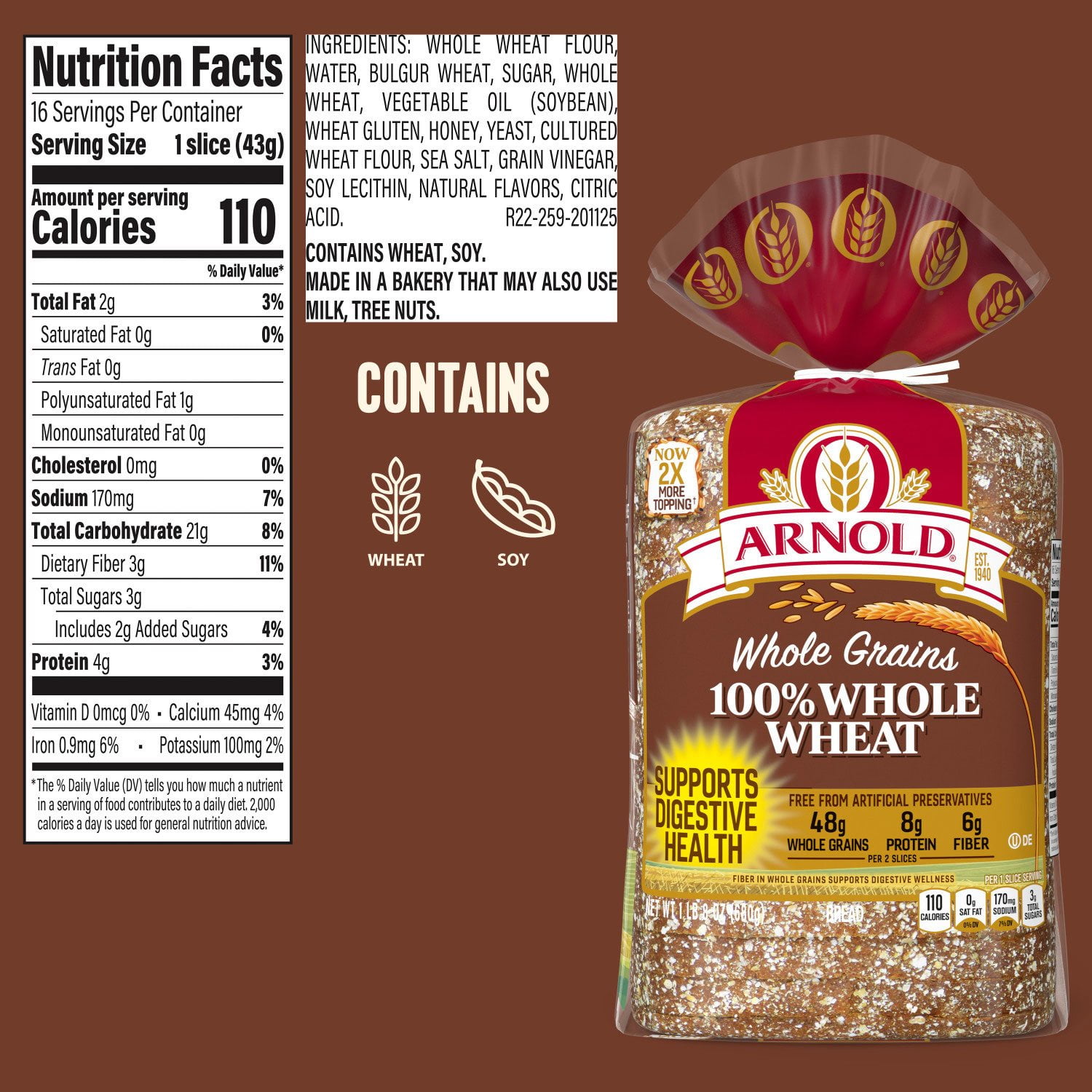 "From Seed to Slice" is our process and our promise to source simple, recognizable ingredients with no added nonsense - the same kinds you would serve to your family and friends. We are committed to eliminating artificial preservatives, colors, and flavors from our products - because we believe that better choices lead to a healthy, happy life and a rich, vibrant world. Arnold Whole Grains 12 Grain bread is baked with the goodness of grains making it a simple choice that supports your goal of living a balanced life! Since 1940, every Arnold loaf is baked with the finest ingredients and care from our bakers to provide the taste people love with the nutrition they feel good about. Arnold 12 Grain bread is filled with nutritional ingredients like whole wheat, sunflower seeds, oats, barley, and brown rice. Arnold bread has no high fructose corn syrup and no artificial preservatives, colors, or flavors with no added nonsense.