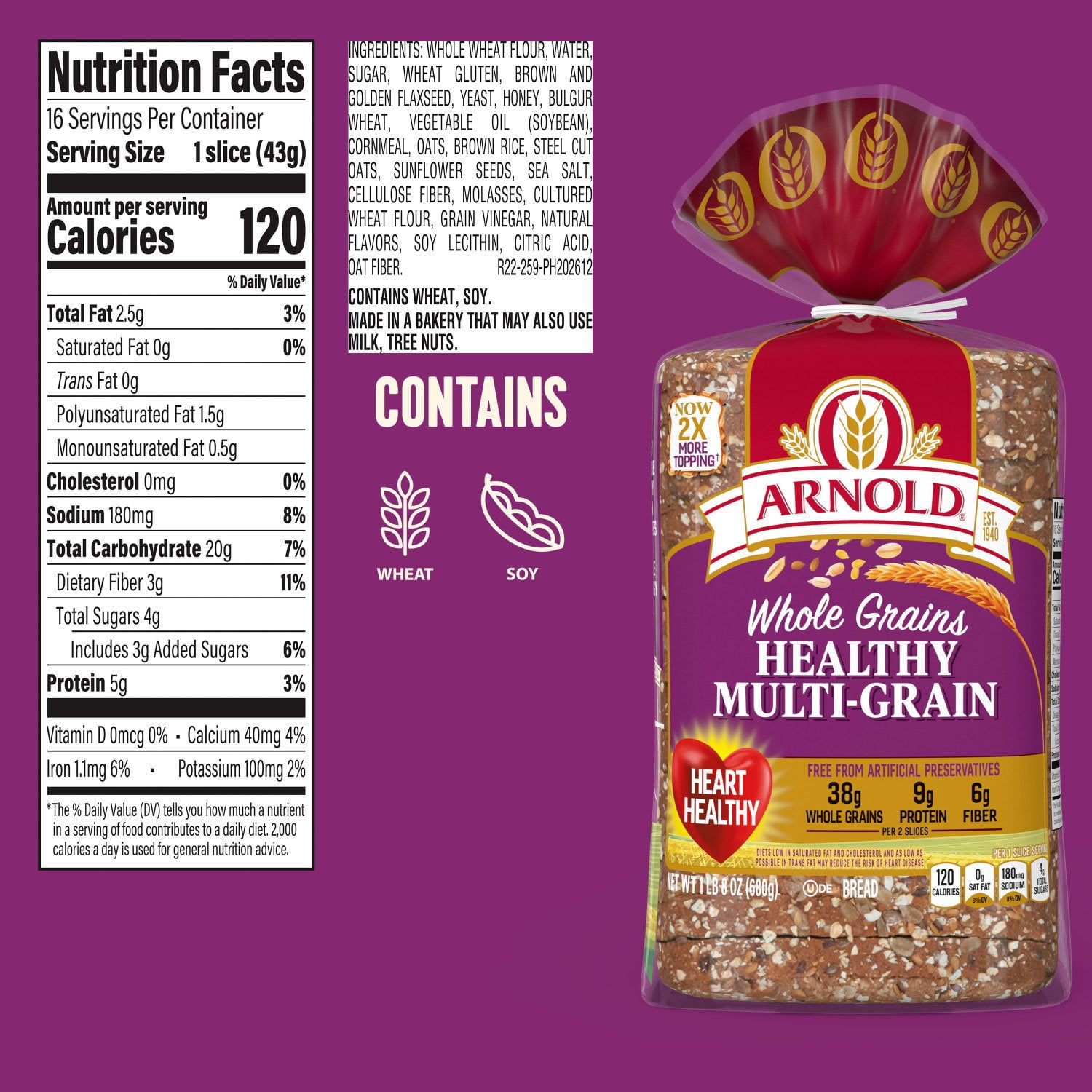 "From Seed to Slice" is our process and our promise to source simple, recognizable ingredients with no added nonsense - the same kinds you would serve to your family and friends. We are committed to eliminating artificial preservatives, colors, and flavors from our products - because we believe that better choices lead to a healthy, happy life and a rich, vibrant world. Arnold Whole Grains Healthy Multi-Grain bread is baked with the goodness of grains making it a simple choice that supports your goal of living a balanced life! Since 1940, every Arnold loaf is baked with the finest ingredients and care from our bakers to provide the taste people love with the nutrition they feel good about. Arnold Healthy Multi-Grain bread is filled with a delicious blend of grains and seeds giving you a hearty flavor and texture you’ll love. Arnold bread has no high fructose corn syrup and no artificial preservatives, colors, or flavors with no added nonsense.