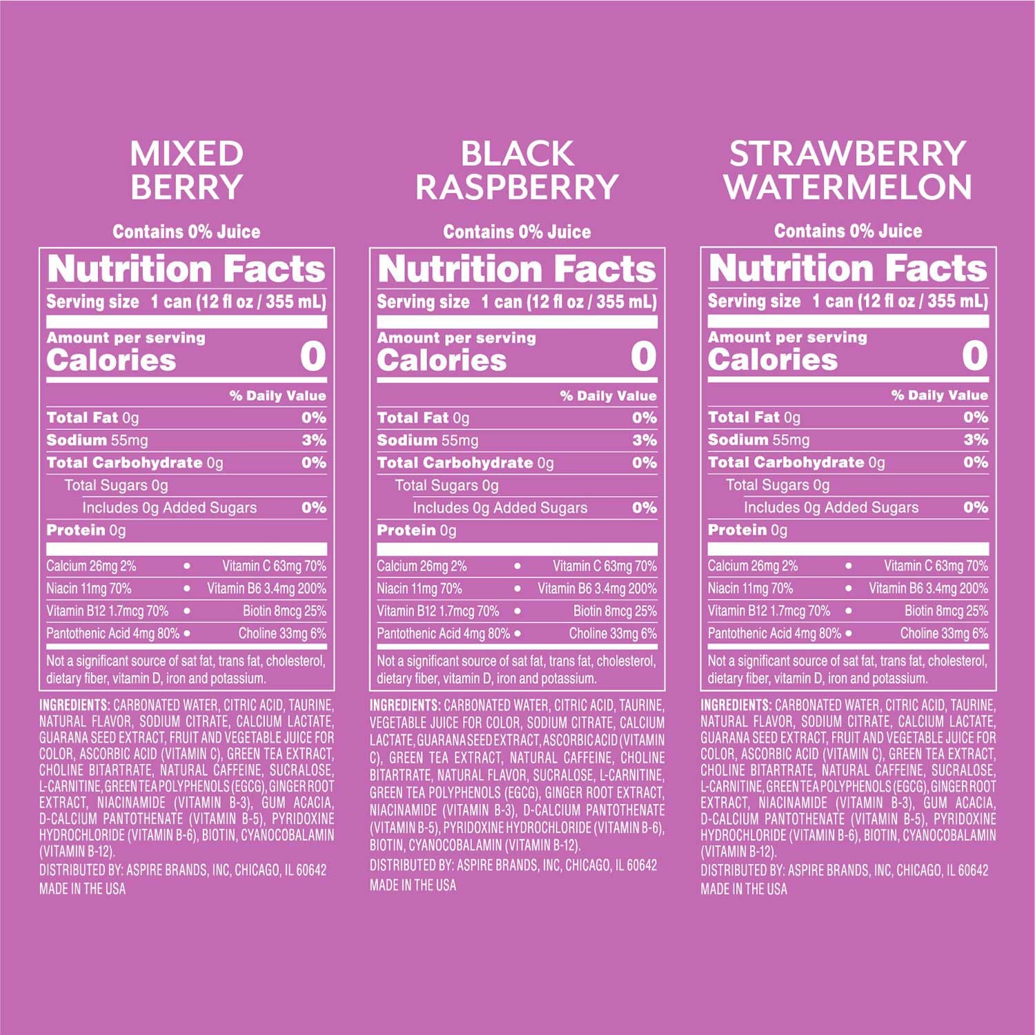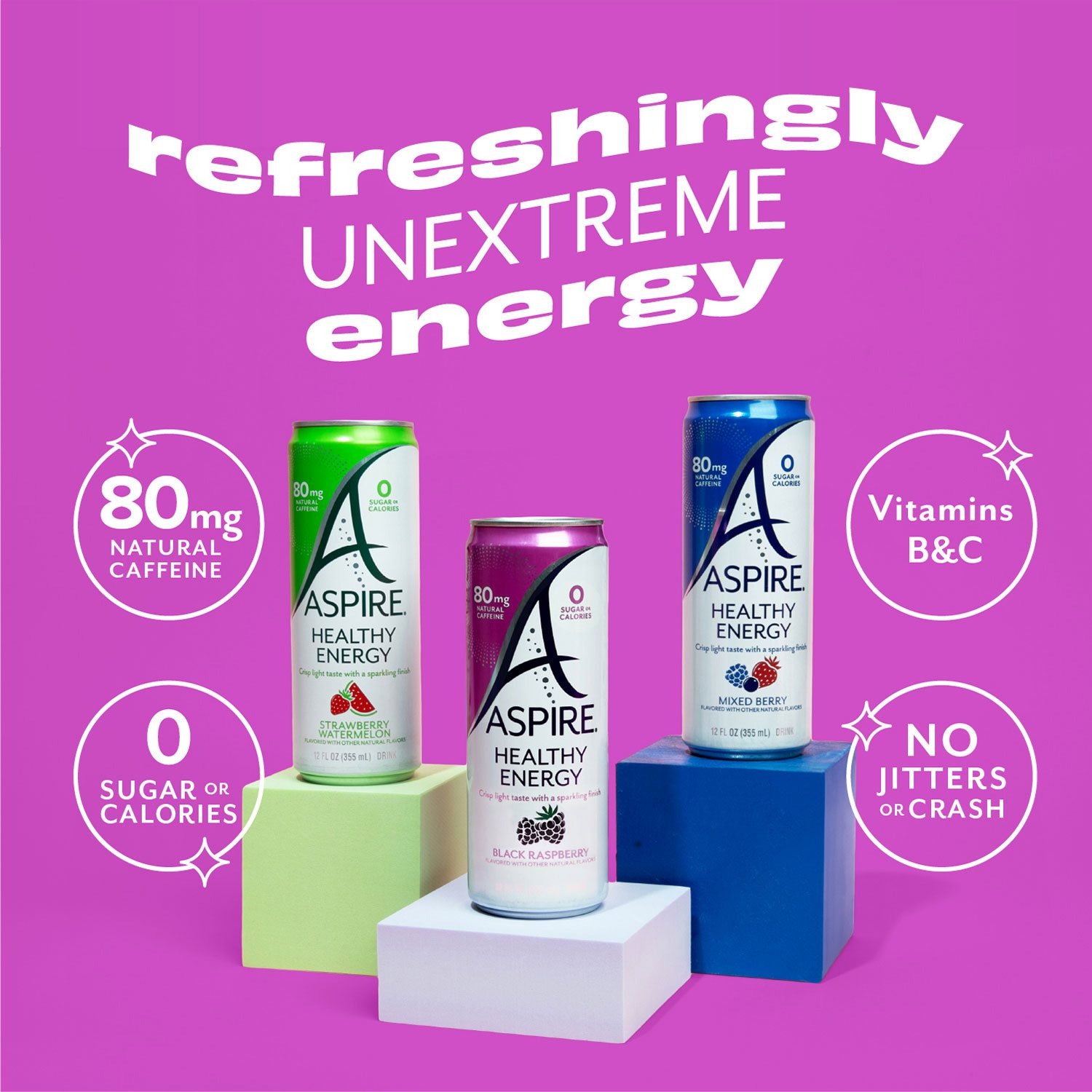 Half the caffeine but still packed with ALL the flavor, with choices like Black Raspberry (exclusive to Sam’s Club), Mixed Berry and Strawberry Watermelon. Life is intense enough. Drink the energy drink designed with real life and moderation in mind. Aspire Energy Drinks, "Refreshingly Unextreme Energy."