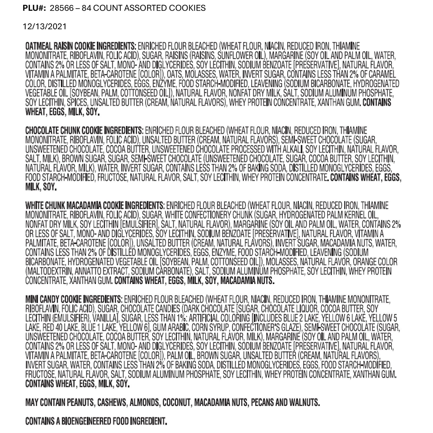 White Chunk Macadamia: Enriched Flour (Wheat Flour, Niacin, Reduced Iron, Thiamin Mononitrate, Riboflavin, Folic Acid) White Candy Chunk (Sugar, Partially Hydrogenated Palm Kernel Oil, Nonfat Dry Milk, Soy Lecithin, Salt, Natural Flavor), Margarine (Palm Oil, Soy Oil, Water, Salt, Mono- And Diglycerides, Soy Lecithin, Sodium Benzoate [Preservative], Beta-carotene Color, Vitamin A Palmitate, Artificial Flavor), Bleached Enriched Flour (Wheat Flour, Niacin, Reduced Iron, Thiamine Mononitrate, Riboflavin, Folic Acid), Sugar, Dark Brown Sugar, Butter (Cream, Natural Flavor), Macadamia Nuts, Invert Sugar Syrup, Water, Sodium Bicarbonate, Eggs, Whey Protien Concentrate, Natural And Artificial Flavor, Salt, Sodium Aluminum Phosphate, Soy Lecithin, Food Starch Modified, Monoglycerides Of Fatty Acids, Maltodextrin, Annatto Extract Color, Sodium Carbonate