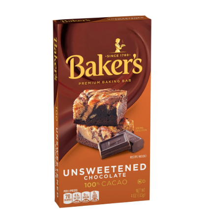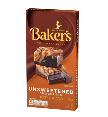 Baker's Unsweetened Baking Chocolate Bar with 100% Cacao brings the decadent taste of smooth unsweetened chocolate to your favorite recipes. This unsweetened chocolate is made with premium cacao. Featuring no added ingredients, it delivers a deep cocoa flavor that's sure to delight the chocolate lovers in your family. Simply break off a few squares from this chocolate bar, and melt them into your cheesecakes, brownies and cakes for a burst of chocolate flavor. The new scored bar snaps cleanly into 1/4 ounce pieces, so you can make small batches with the same precision as large recipes. Each 4 ounce bar comes in a paper wrapper keeping the unused portions contained inside the box until your next baking session.