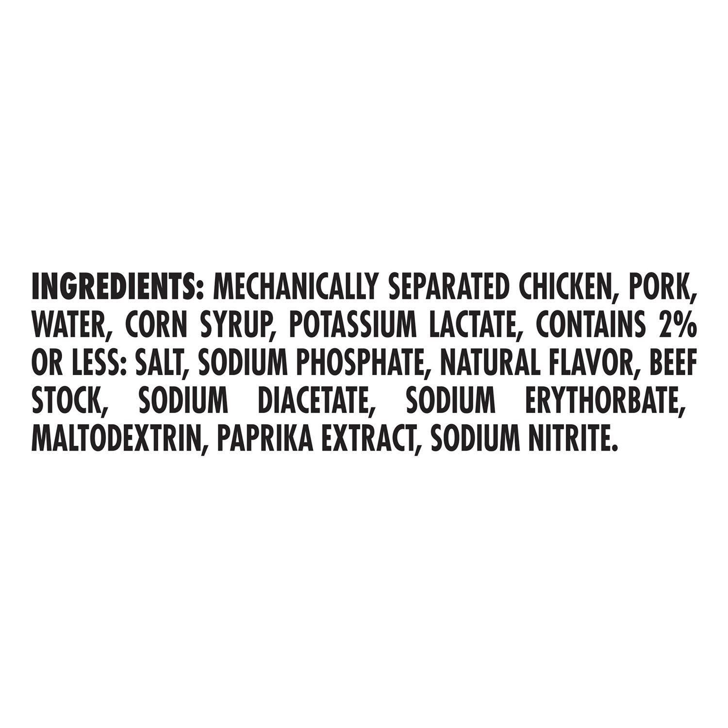 Mechanically Separated Chicken, Pork, Water, Corn Syrup, Potassium Lactate, Contains 2 % or Less: Salt, Sodium Phosphate, Natural Flavor, Beef Stock, Sodium Diacetate, Sodium Erythorbate, Maltodextrin, Paprika Extract, Sodium Nitrite